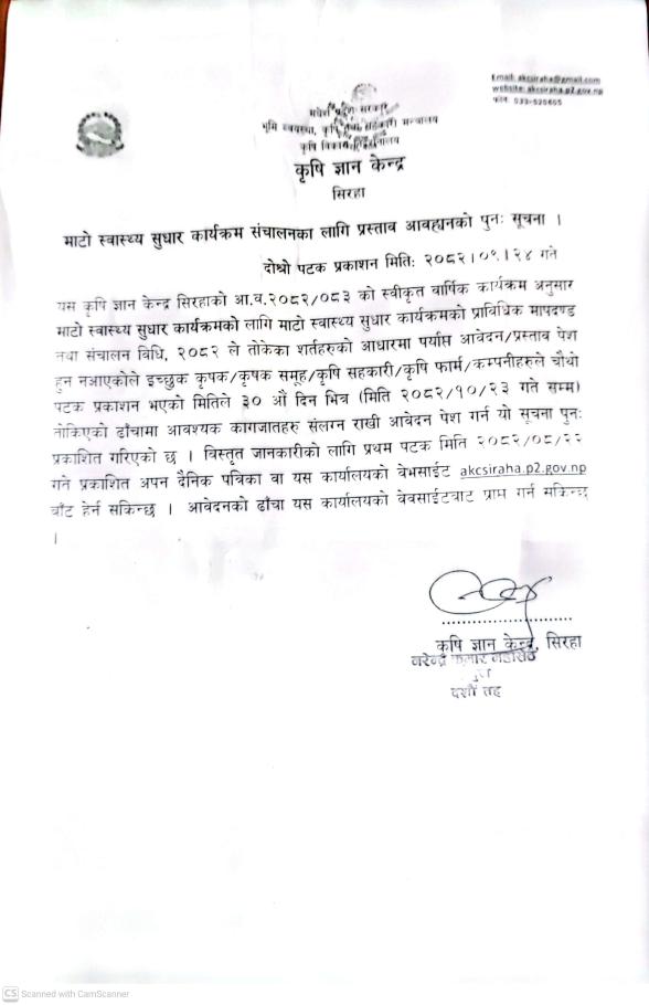 माटो स्वास्थ सुधार कार्यक्रम संचालनका लागि प्रस्ताव आवहानको पुन: सुचना ।।कृषि ज्ञान केन्द्र सिरहाको सुचना ।।।