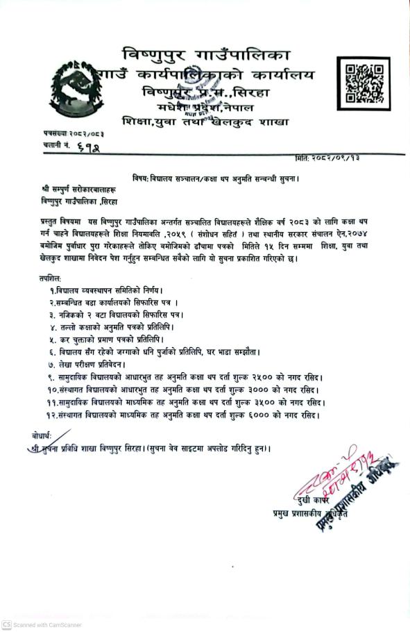 » विद्यालय संचालन/कक्षा थप अनुमती सम्बन्धि सुचना , श्री सम्पुर्ण सरोकारबालाहरु विष्णुपुर गाउँपालिका, सिरहा ।।।