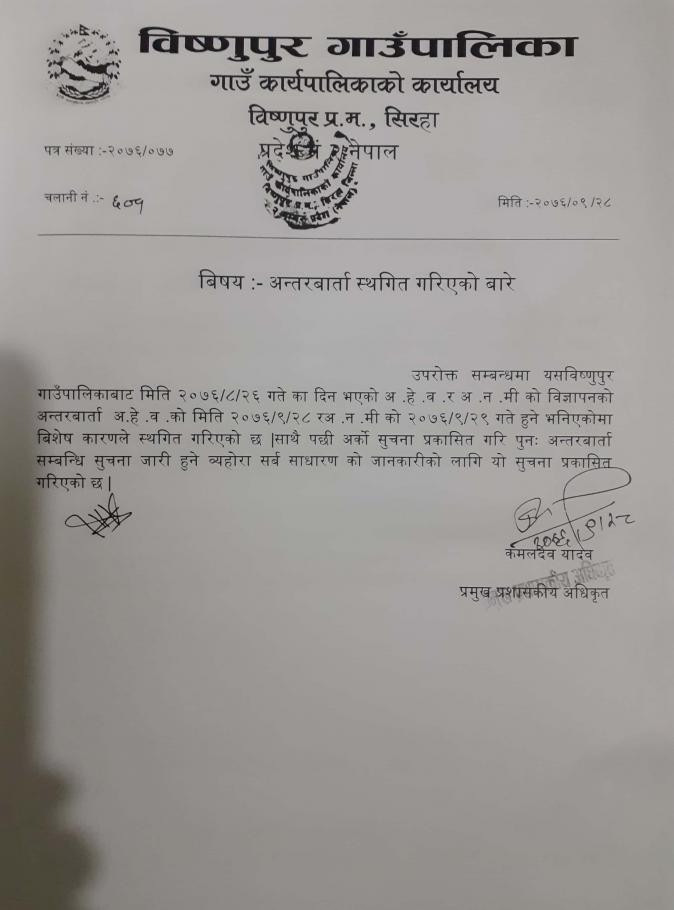 अ.हे.व. र अ.न.मि. को अन्तरवार्ता स्थगित गरिएको वारे सुचना मितिः- २०७६/०९/२८ गते ।