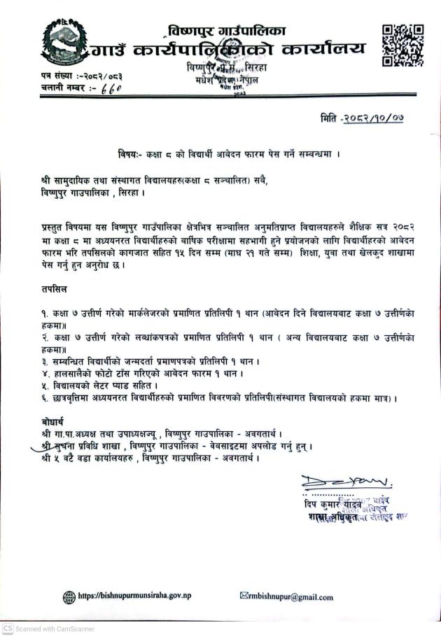 कक्षा ८ को विद्यार्थी आवेदन फारम पेस गर्ने सम्बन्धमा, श्री सामुदायिक तथा संस्थागत विद्यालयहरु ( कक्षा ८ संचालित ) सबै , विष्णुपुर गाउँपालिका, सिरहा ।।।
