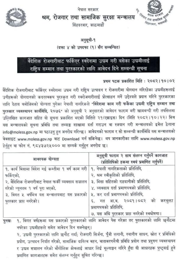 वैदेशिक रोजगरिबाट फर्किएर स्वदेशमा उधम गरि बसेका उधमिलाइ राष्ट्रिय सम्मान तथा पुरस्कारको लागि आवेदन दिने सम्बन्धि सुचना ।।।।