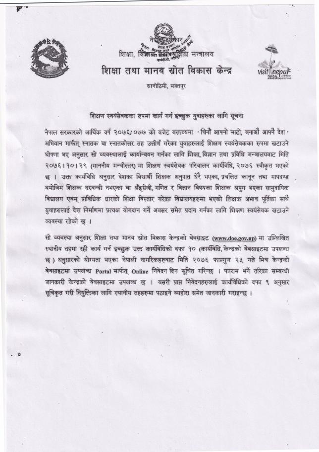 शिक्षक स्वयंसेवकका रुपमा कार्य गर्न इच्छुक युवाहरुका लागि सुचना शिक्षा तथा मानव स्रोत विकास केन्द्र, सानोठिमि, भक्तपुर बाट प्रकाशित सुचना ।।।।।