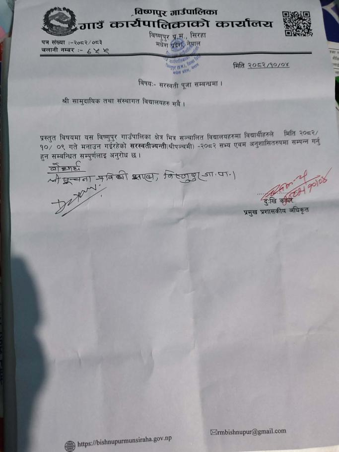 सरस्वती पुजा सम्बन्धमा , श्री सामुदायिक तथा संस्थागत विद्यालयहरु सबै ।।।।