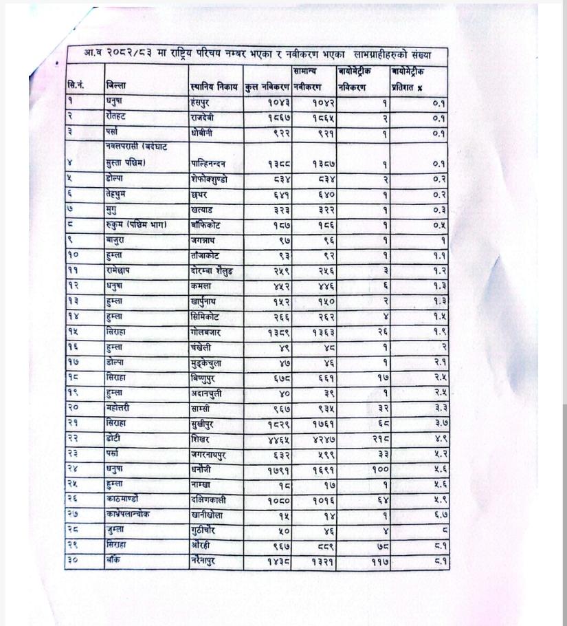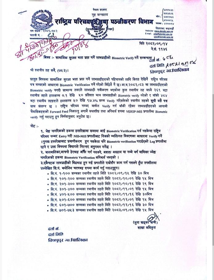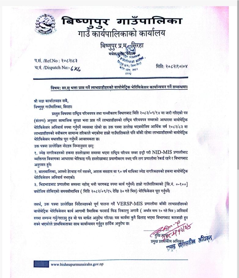 सा.सु. भत्ता प्राप्त गर्ने लाभग्राहिहरुको बायोमेट्रीक कार्यान्वयन गर्ने सम्बन्धमा , श्री वडा कार्यालयहरु सबै , विष्णुपुर गाउँपालिका, सिरहा ।।।