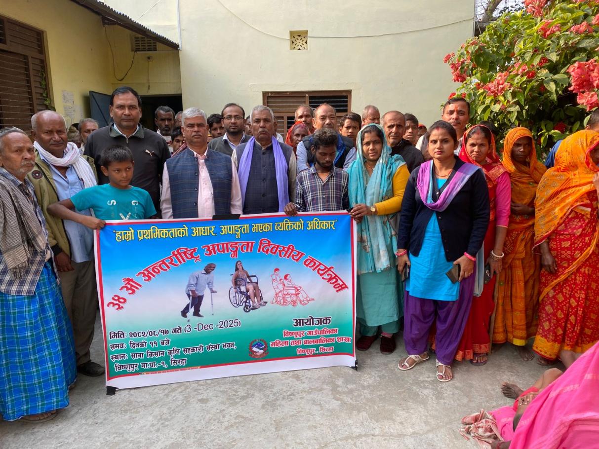 Home » हाम्रो प्राथमिकताको आधार अपाङ्गता भएका व्यक्तिको अधिकार नारा सहित ३४ औ अन्तरास्ट्रिय अपाङ्गता दिवसीय कार्यक्रम सफल्ताका साथ मनाइयो, आयोजक विष्णुपुर गाउँपालिका, महिला तथा बालबालिका शाखा,विष्णुपुर,सिरहा ।।।।