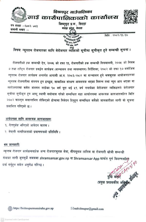 न्युनतम रिजगारिका लागी बेरोजगार व्यक्तिको सुचिमा सुचिकृत हुने सम्बन्धि सम्बन्धित सबैमा जानकारीको सूचना ।।।।